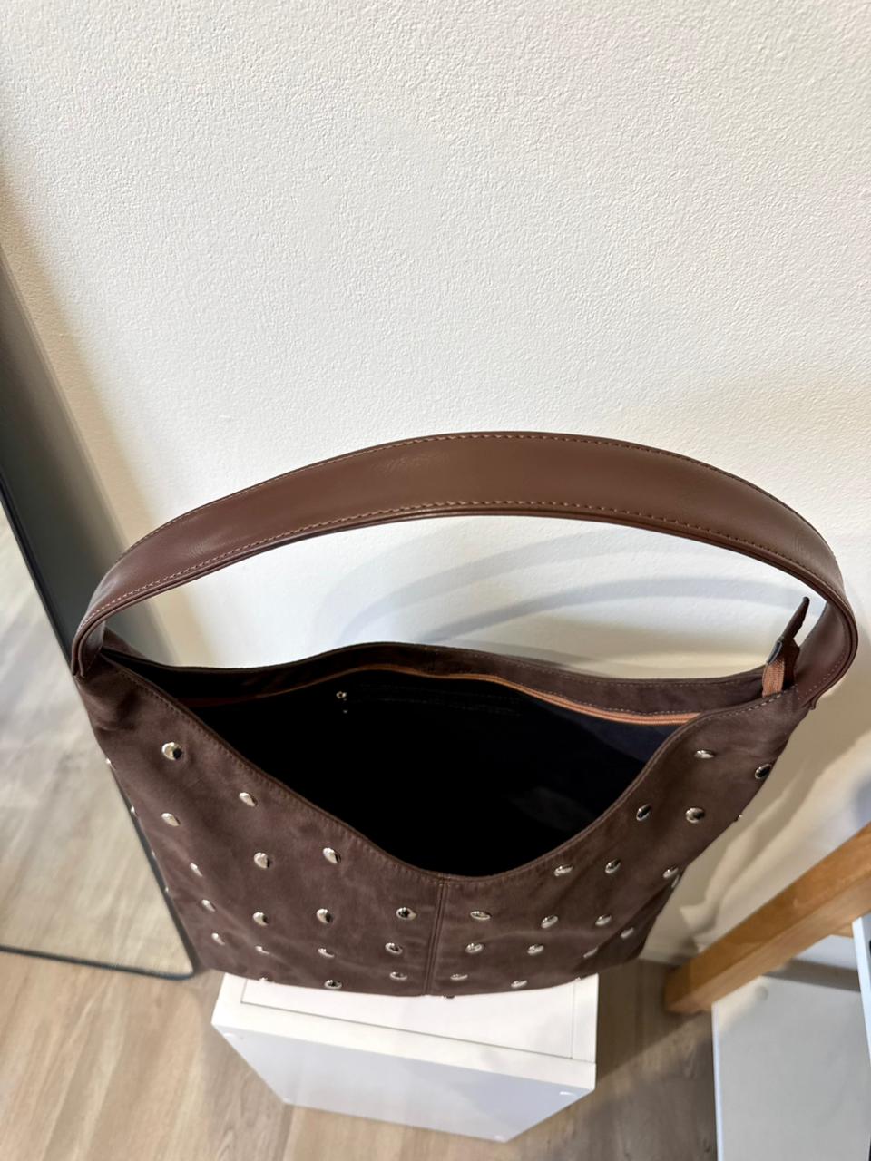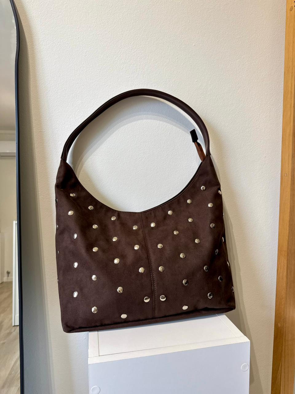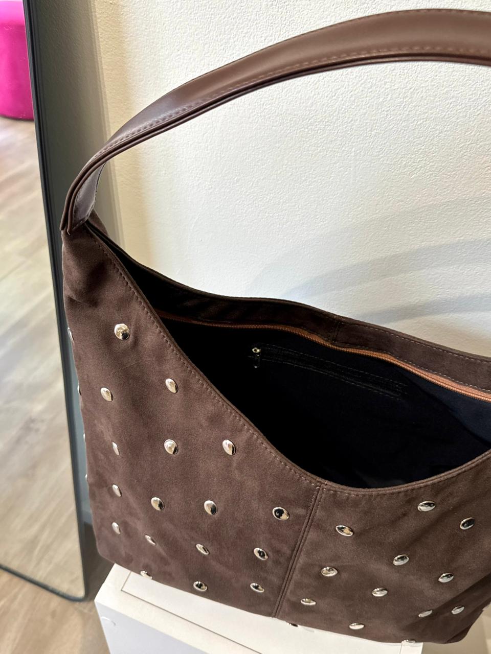 Cartera de gamuza sintética con detalles de tachas metálicas. Diseñada para acompañarte todos los días con estilo, combina una textura suave con una estructura cómoda y funcional.