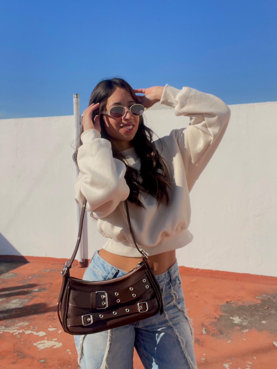 Confeccionada en eco-cuero de excelente calidad, cuenta con correa regulable a ambos lados mediante hebillas metálicas, lo que te permite ajustarla a tu medida y llevarla cómodamente al hombro.