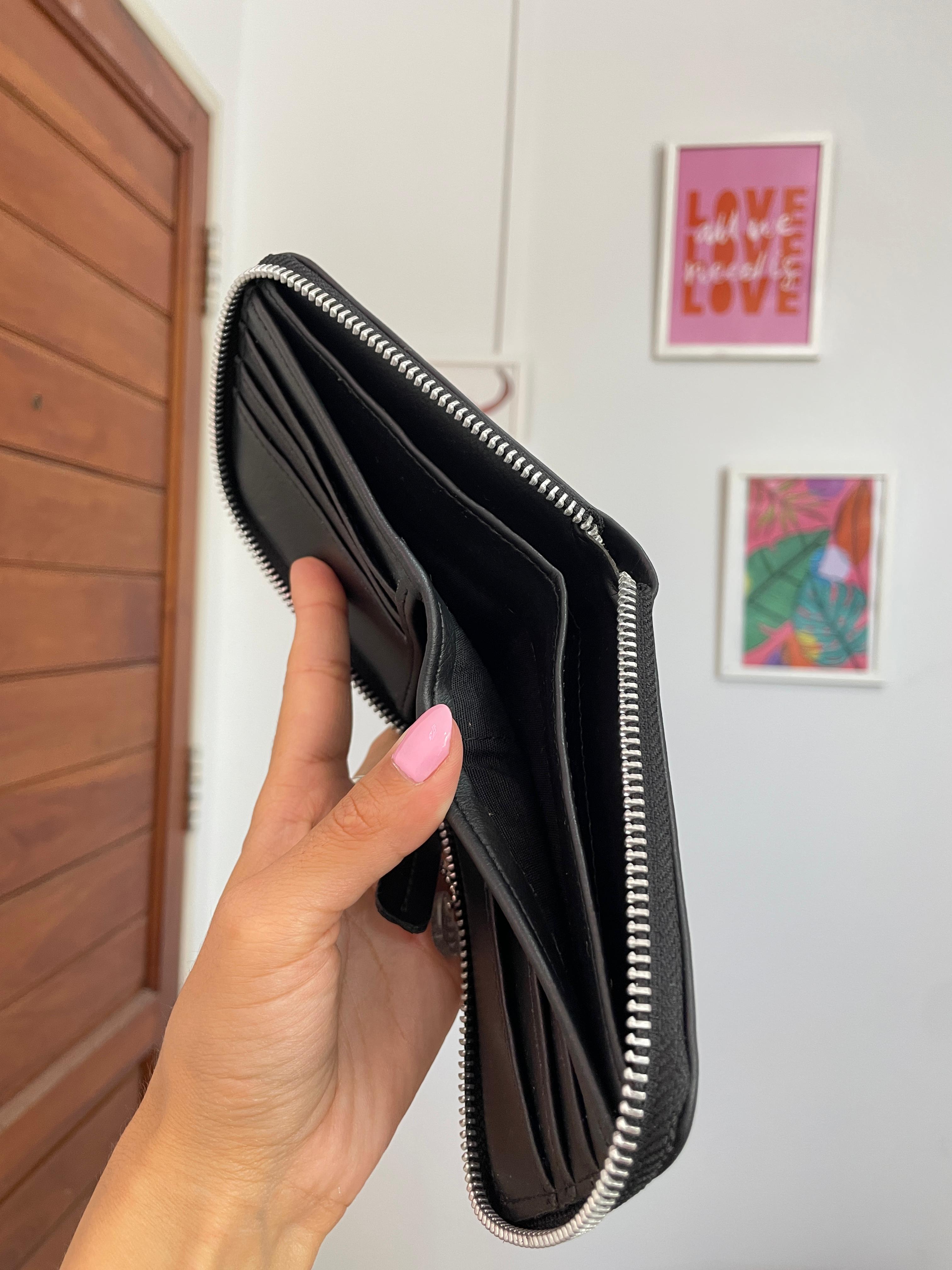 Tiene espacio para 6 tarjetas, 2 solapas para billetes y 2 bolsillos ocultos