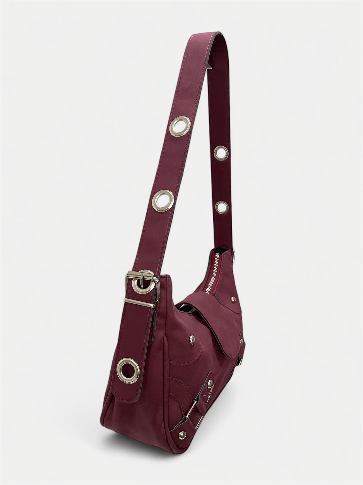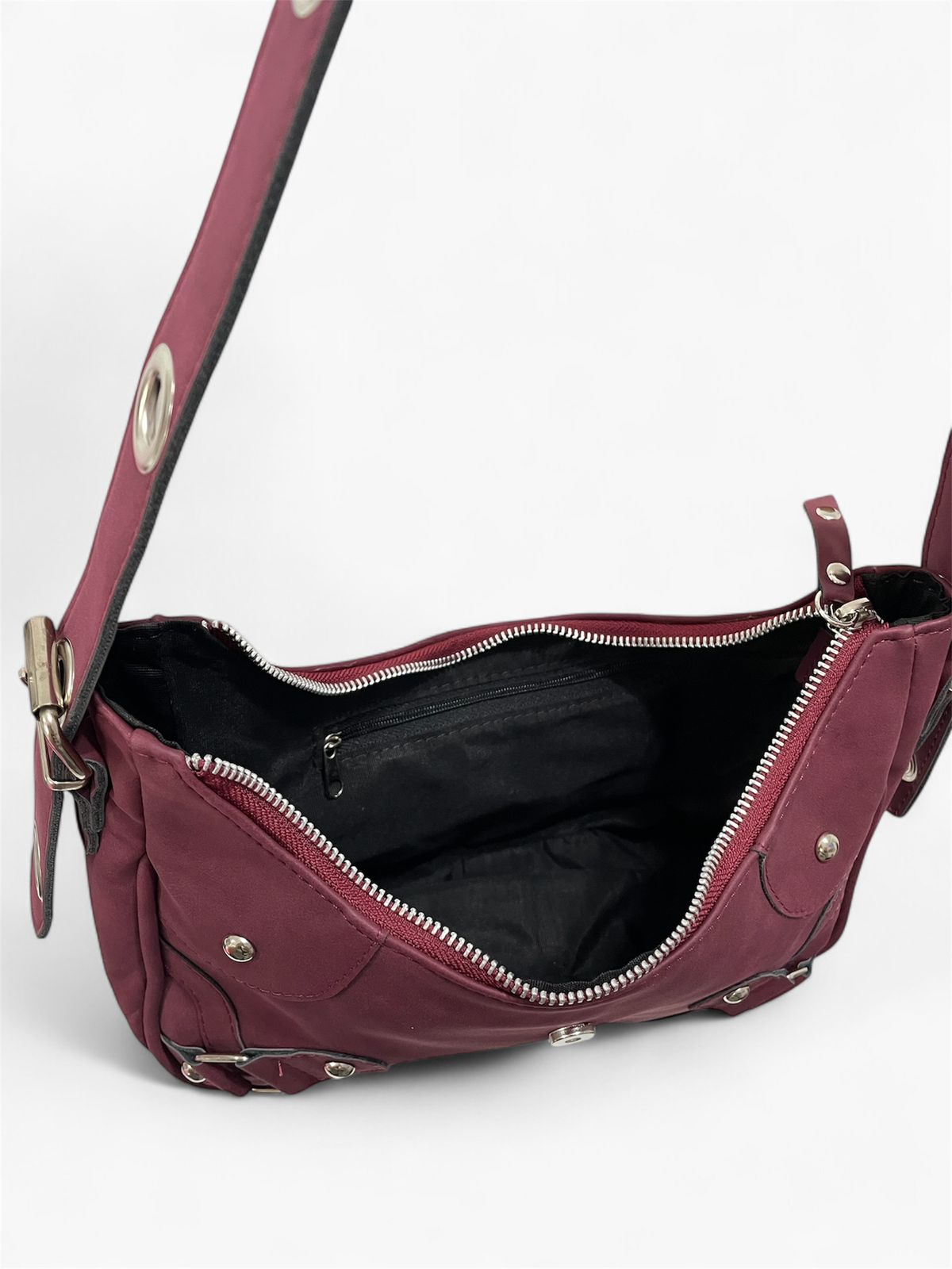 Confeccionada en eco-cuero nobuck, cuenta con correa regulable a ambos lados mediante hebillas metálicas, lo que te permite ajustarla a tu medida y llevarla cómodamente al hombro.