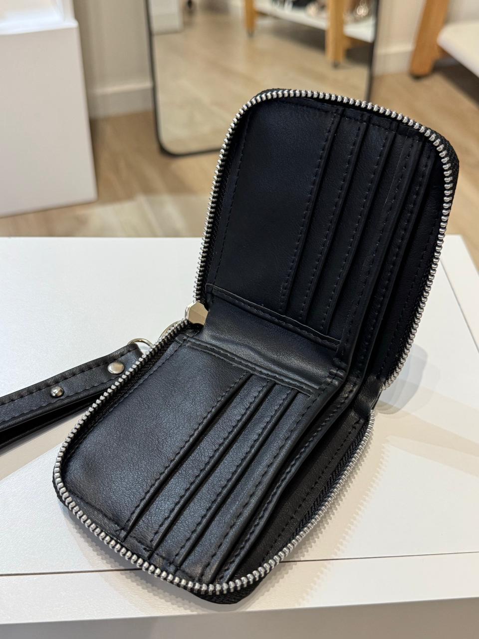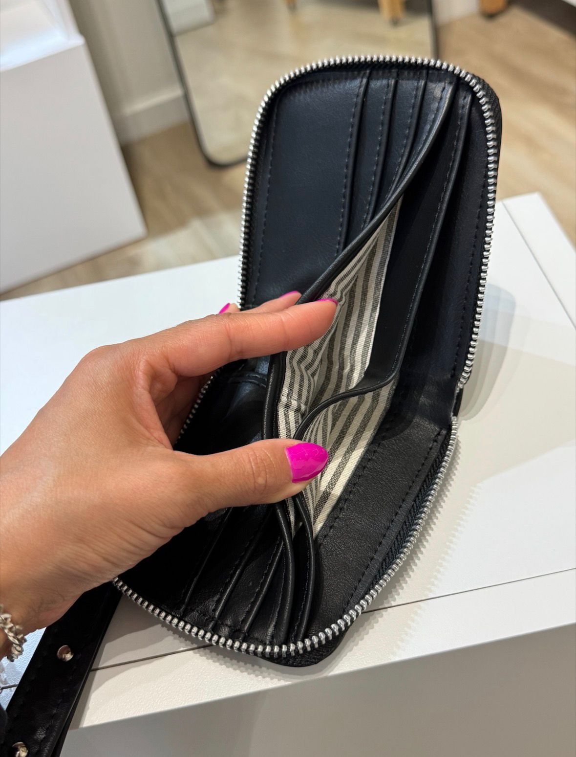 Tiene espacio para 6 tarjetas, 2 solapas para billetes y 2 bolsillos ocultos.