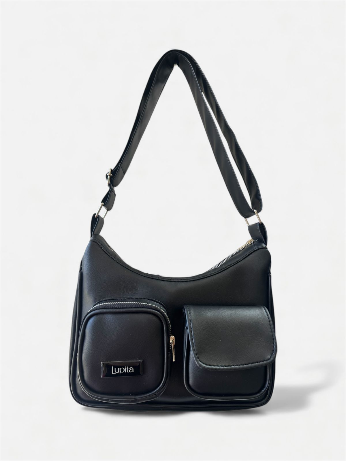 Posee 2 bolsillos frontales, uno con cierre y otro con broche imantado.