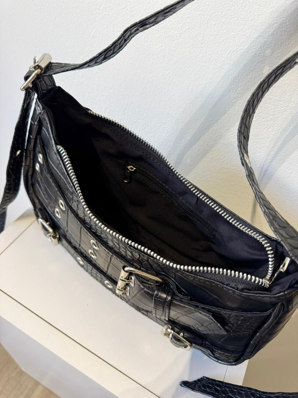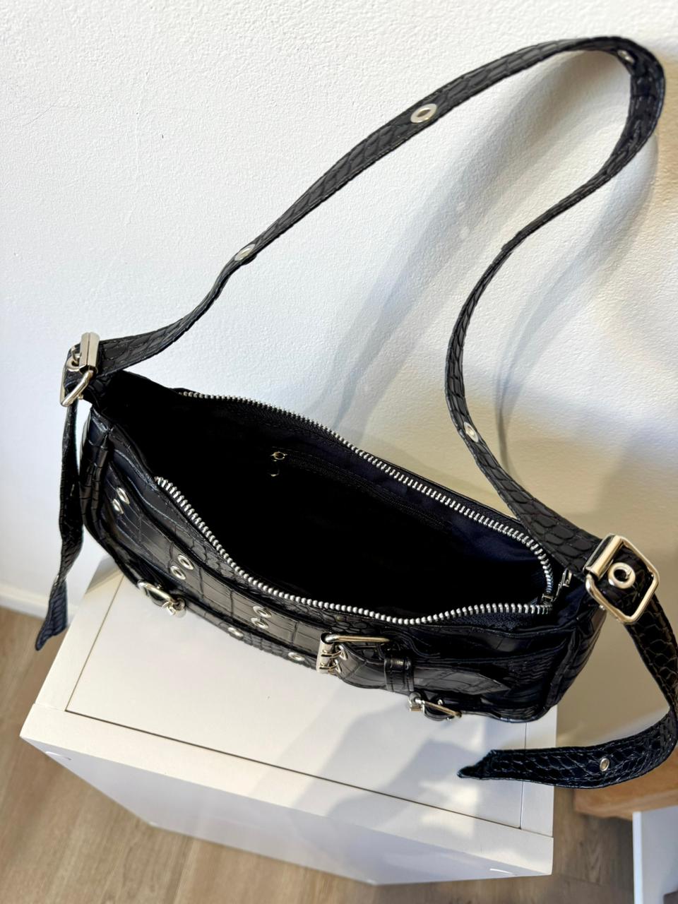 Confeccionada en cuero ecologico de excelente calidad, cuenta con correa regulable a ambos lados mediante hebillas metálicas, lo que te permite ajustarla a tu medida y llevarla cómodamente al hombro.