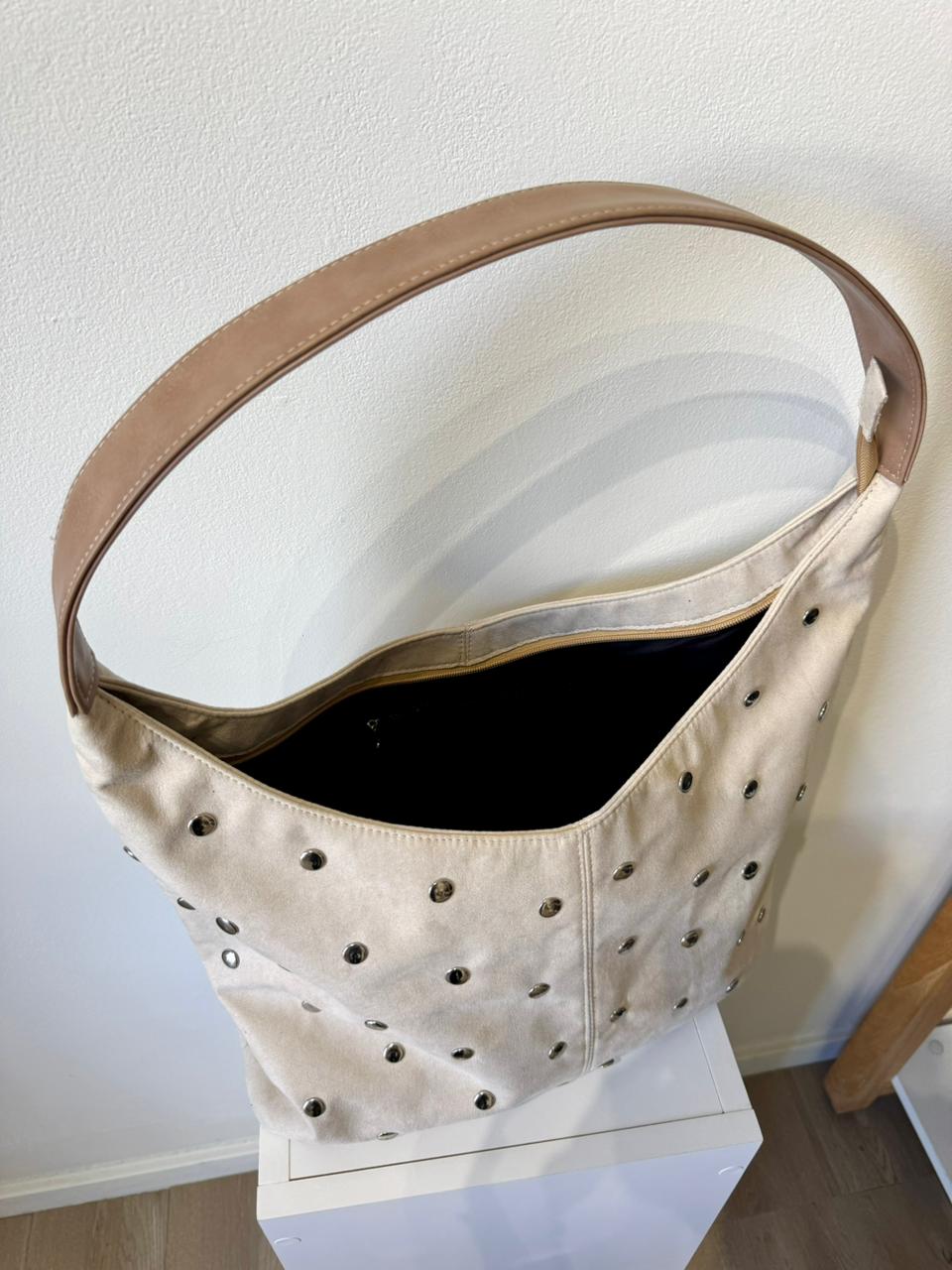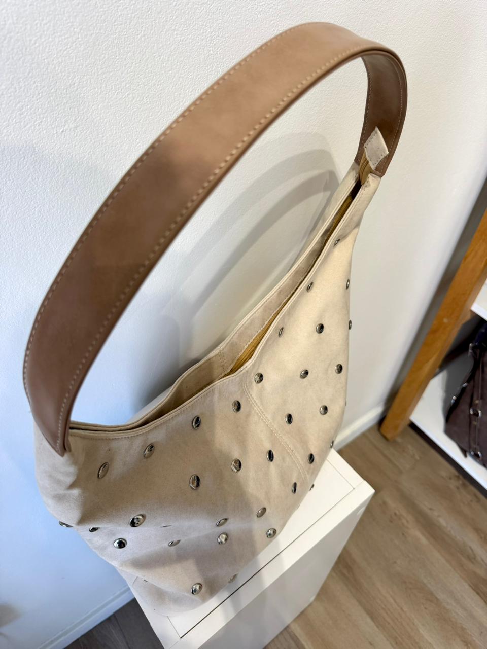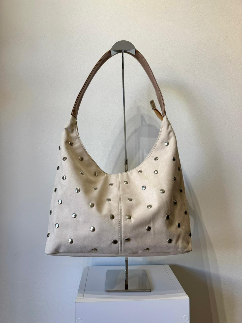 Cartera de gamuza sintética con detalles de tachas metálicas. Diseñada para acompañarte todos los días con estilo, combina una textura suave con una estructura cómoda y funcional.