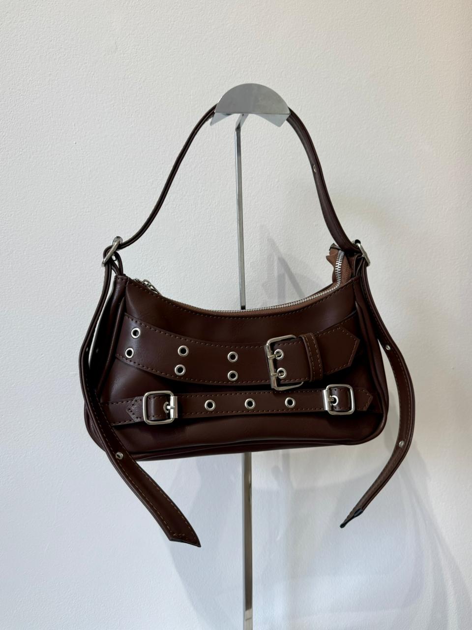En el exterior, se destacan detalles metálicos protagonistas absolutos en este diseño. Su interior está completamente forrado e incluye un bolsillo con cierre.