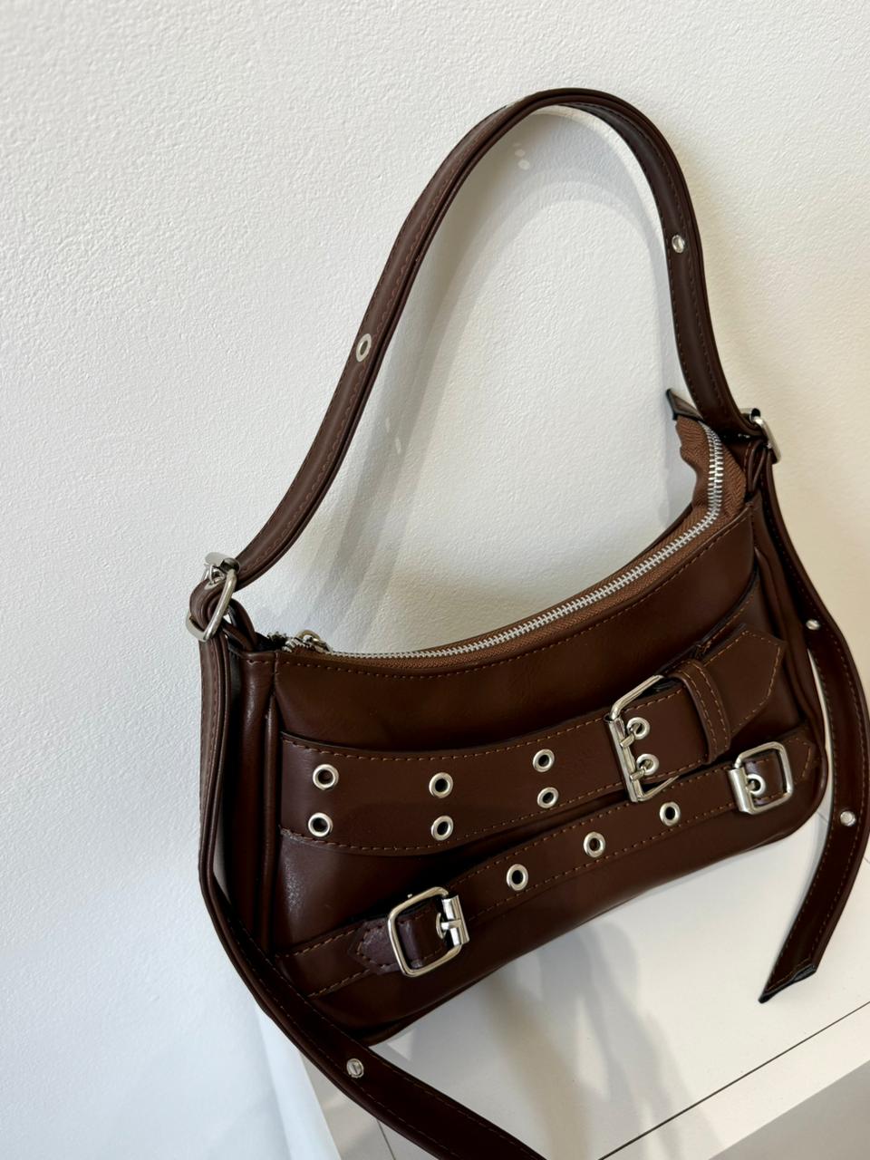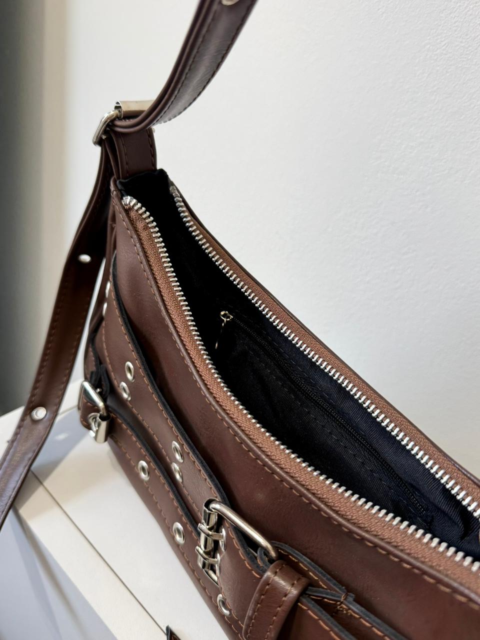 Confeccionada cuero ecologico de calidad, cuenta con correa regulable a ambos lados mediante hebillas metálicas, lo que te permite ajustarla a tu medida y llevarla cómodamente al hombro.