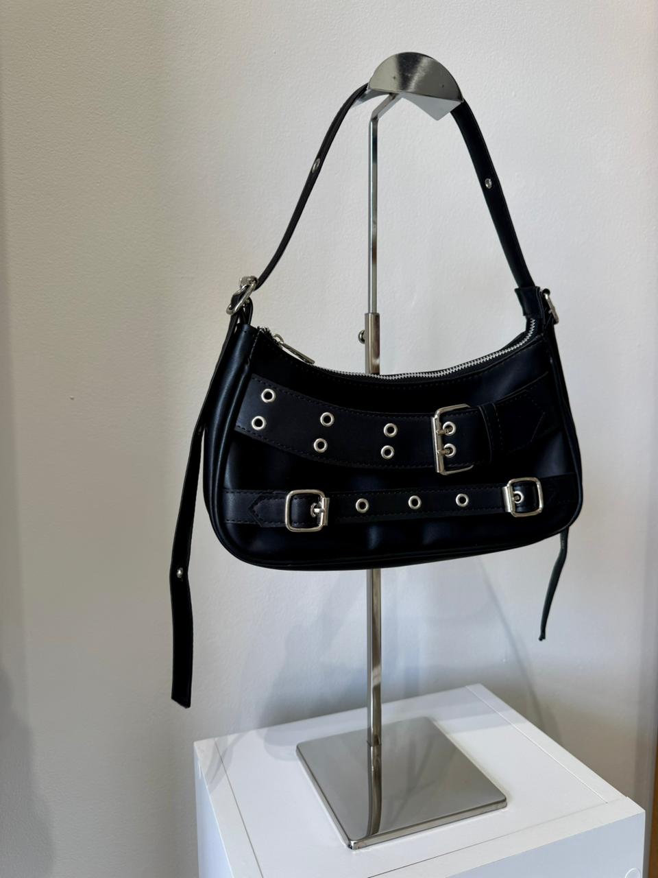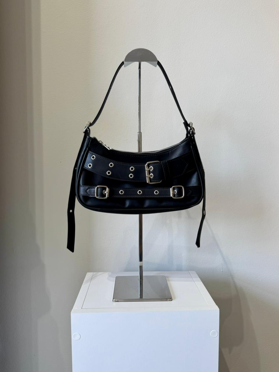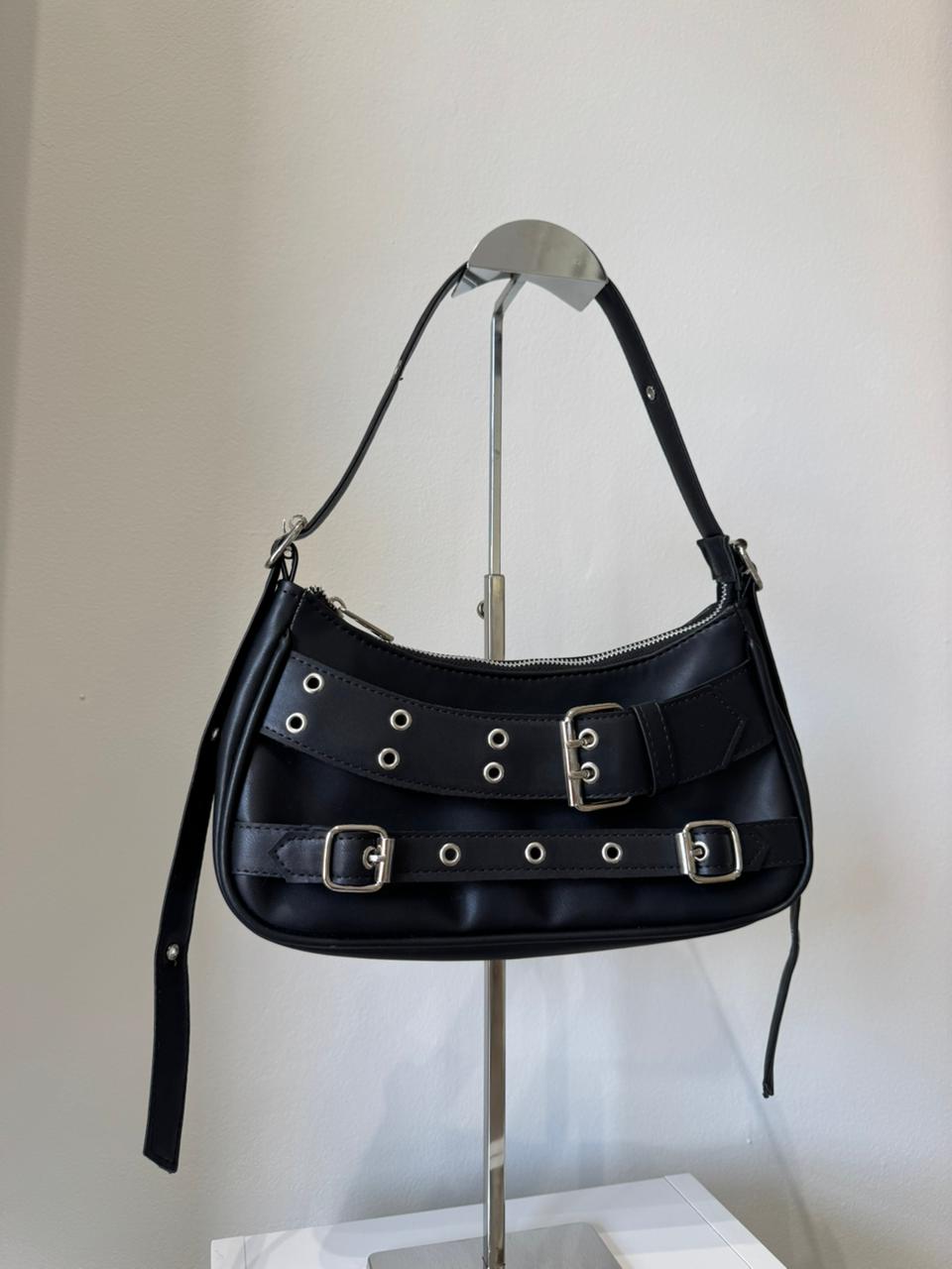 Confeccionada en eco-cuero de excelente calidad, cuenta con correa regulable a ambos lados mediante hebillas metálicas, lo que te permite ajustarla a tu medida y llevarla cómodamente al hombro.
