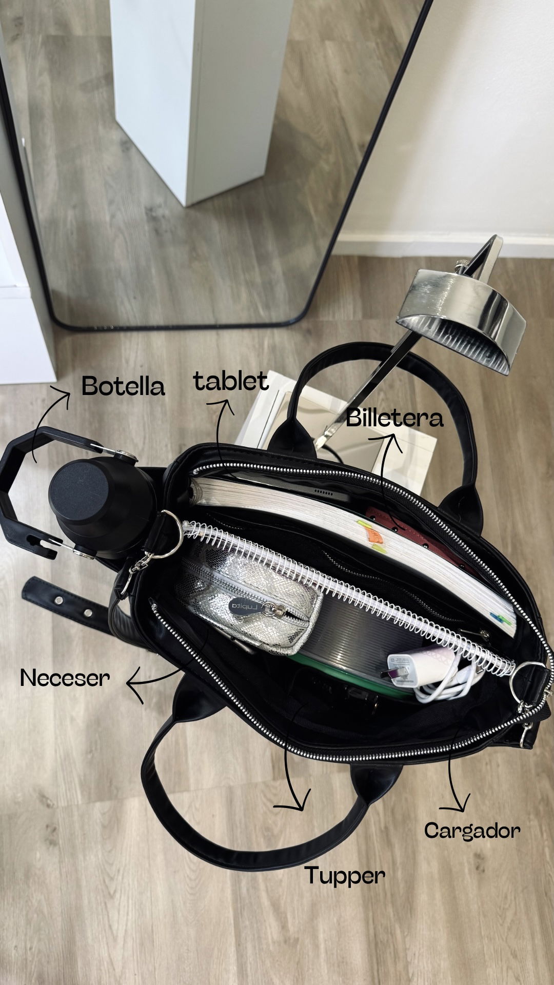 En el exterior, tiene dos bolsillos frontales y dos bolsillos laterales portabotellas. Se puede llevar cómodamente del antebrazo gracias a sus manijas cortas, o al hombro con la correa larga regulable tipo cinto, con ojales metálicos y hebilla.