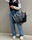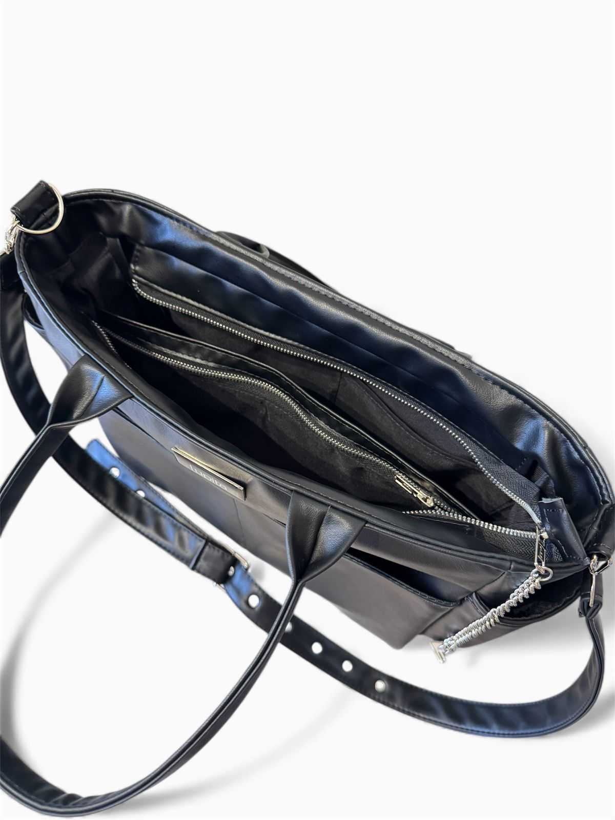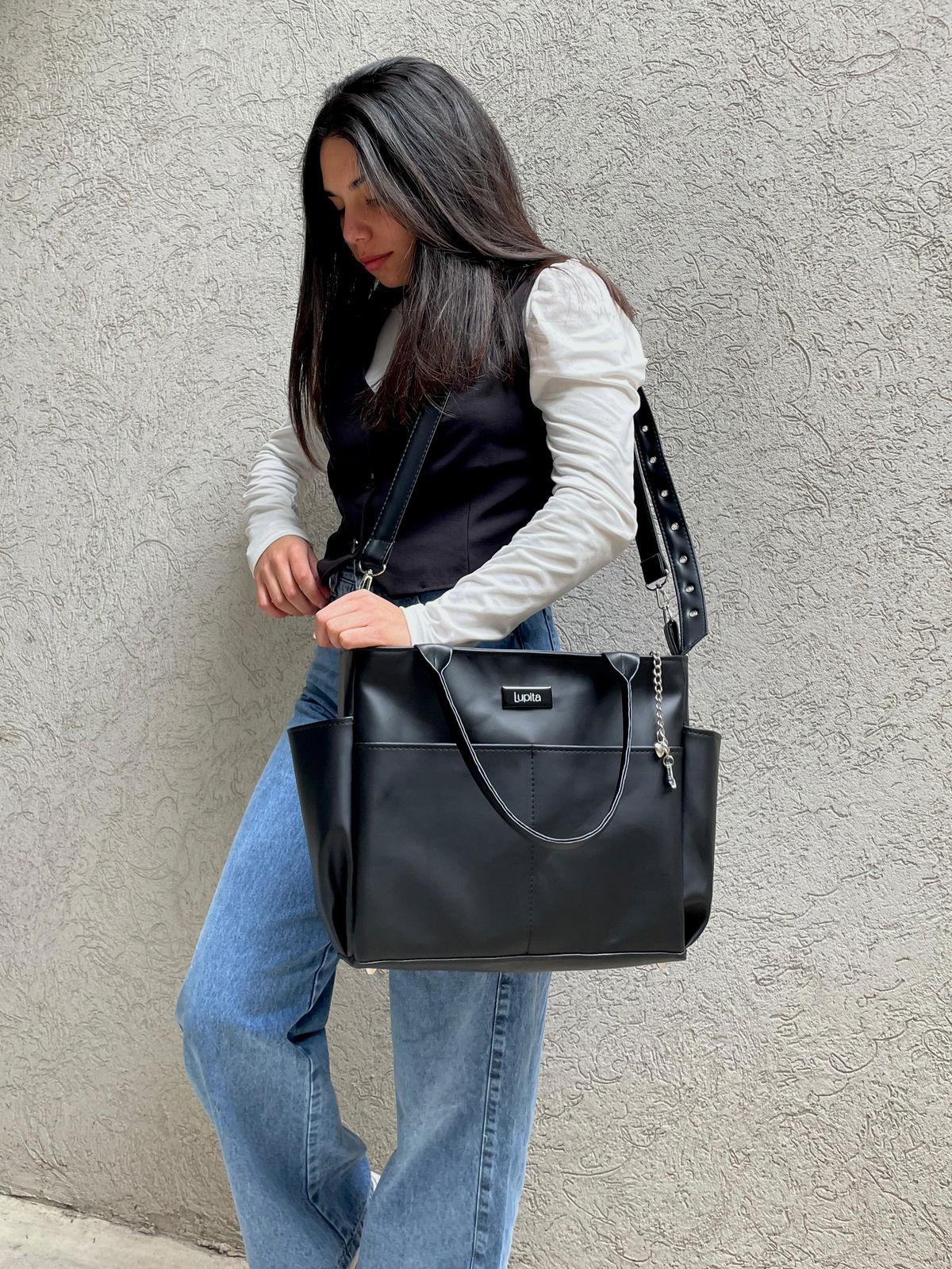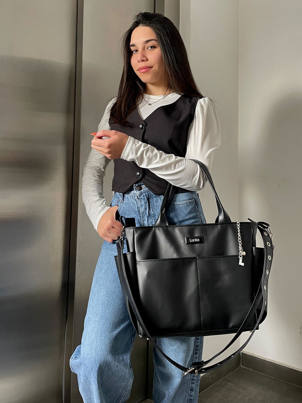 En el exterior, tiene dos bolsillos frontales y dos bolsillos laterales portabotellas. Se puede llevar cómodamente del antebrazo gracias a sus manijas cortas, o al hombro con la correa larga regulable tipo cinto, con ojales metálicos y hebilla.