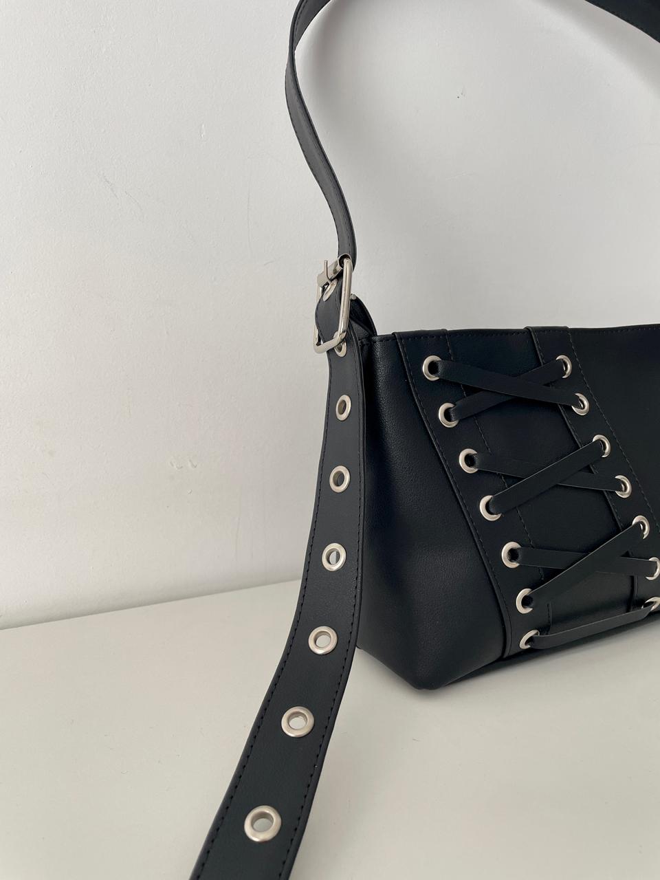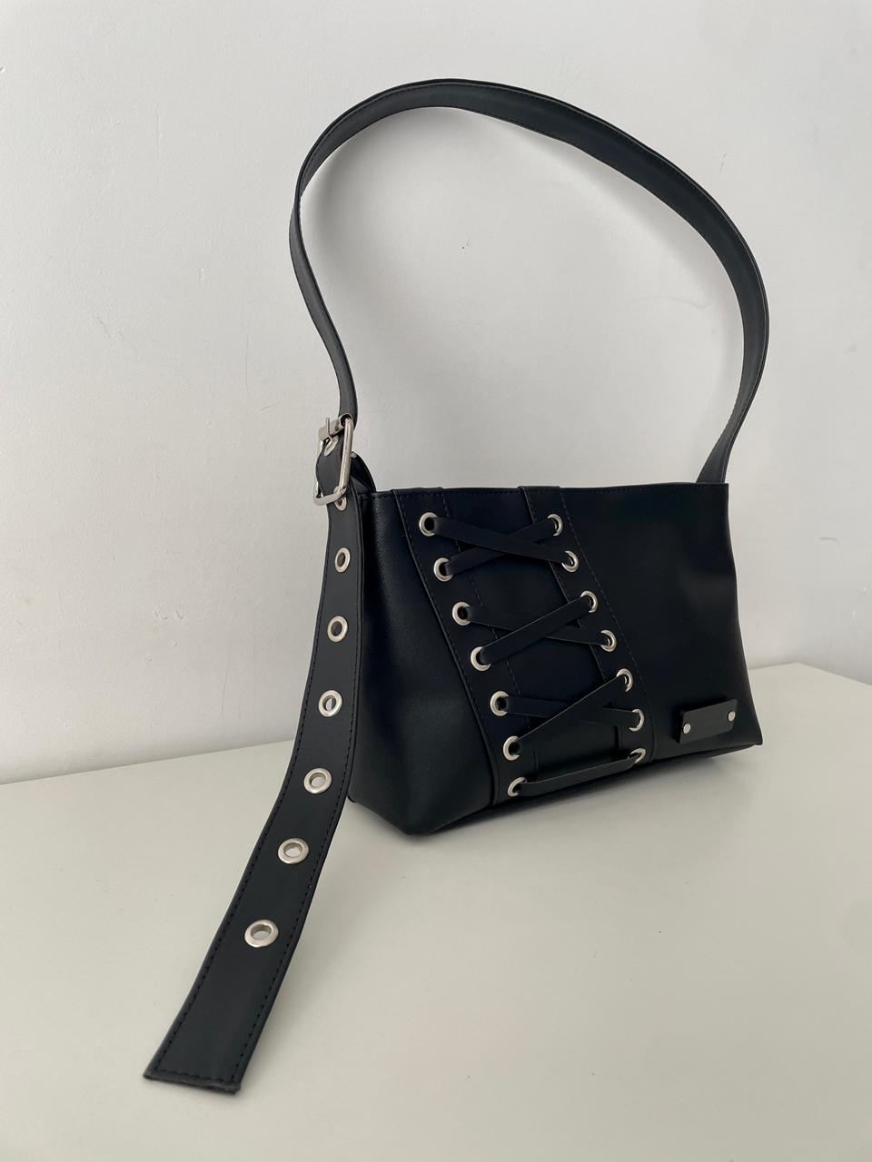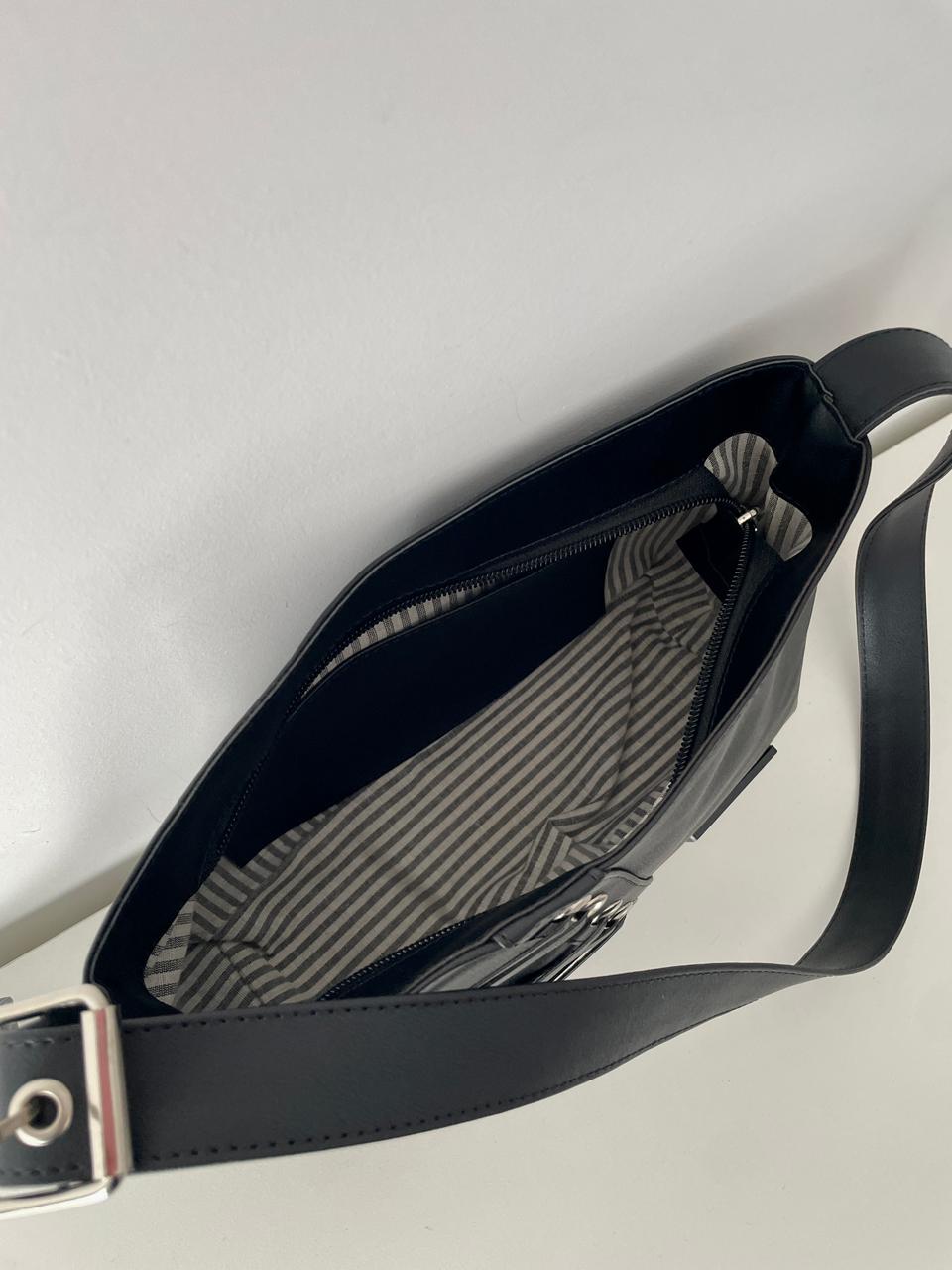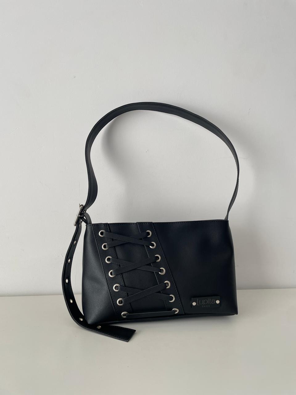 Bag confeccionada en cuero ecologico, posee cierre para mayor seguridad y un frente con detalles trenzados que le aportan caracter. Su interior está forrado en gross resinado y cuenta con un bolsillo interno.