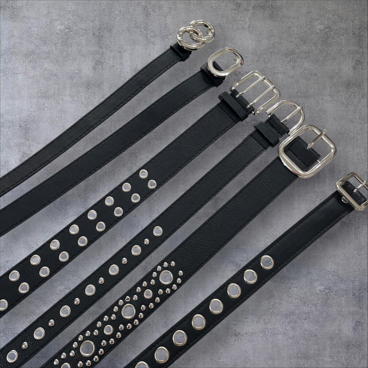 Cinto: de cuero sintetico con hebilla metálica. Medida: 109cm de largo, 2,5cm de ancho (abarca hasta talle 44).