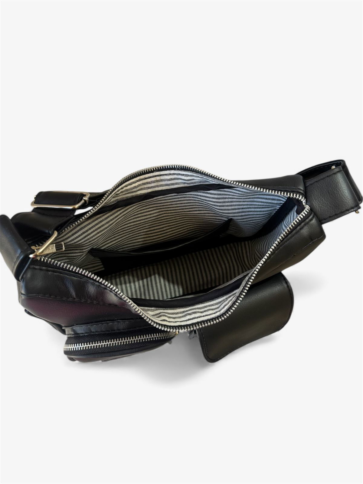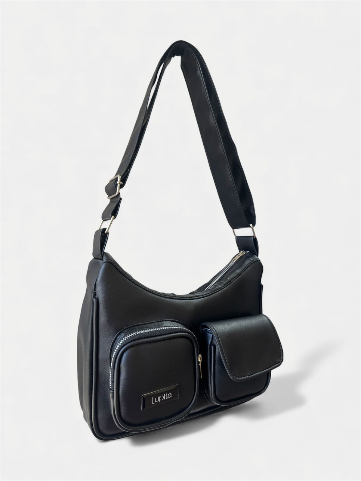 Posee 2 bolsillos frontales, uno con cierre y otro con broche imantado.
