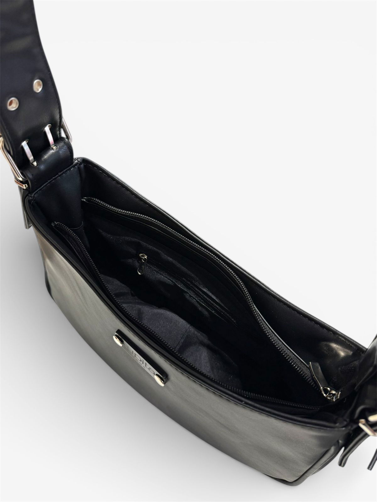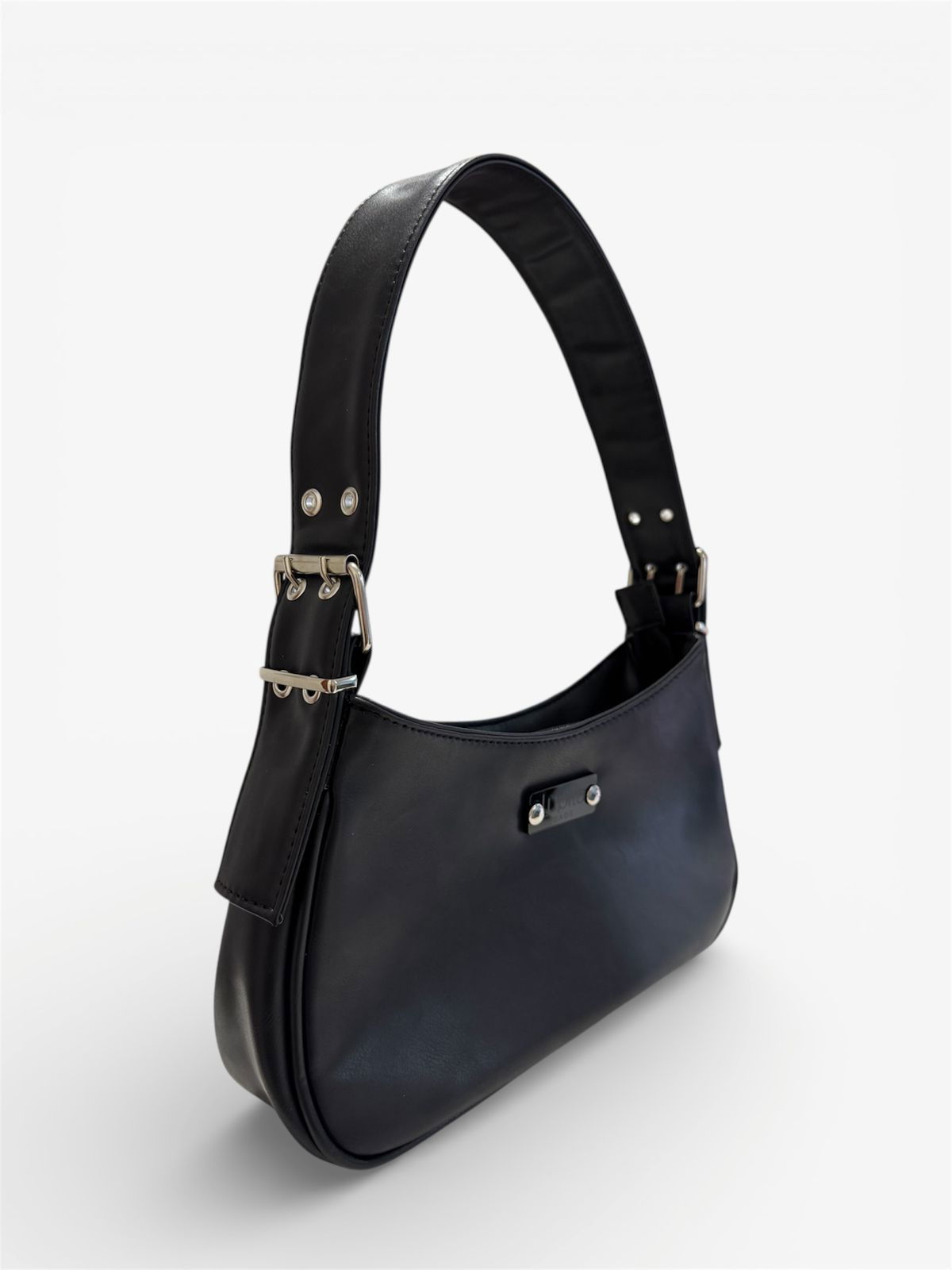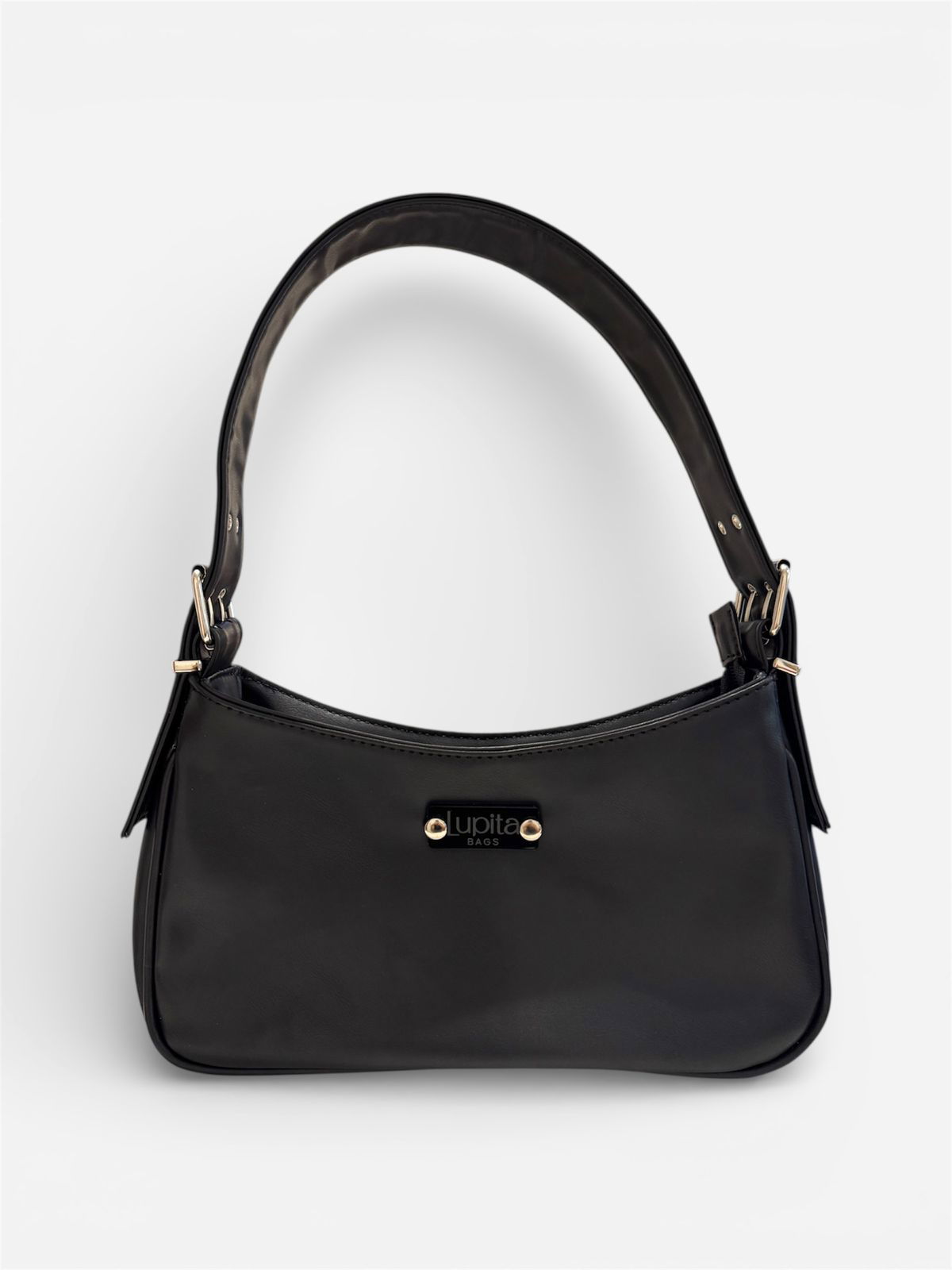 Confeccionada en eco-cuero, cuenta con correa regulable a ambos lados mediante hebillas metálicas, lo que te permite ajustarla a tu medida y llevarla cómodamente al hombro.