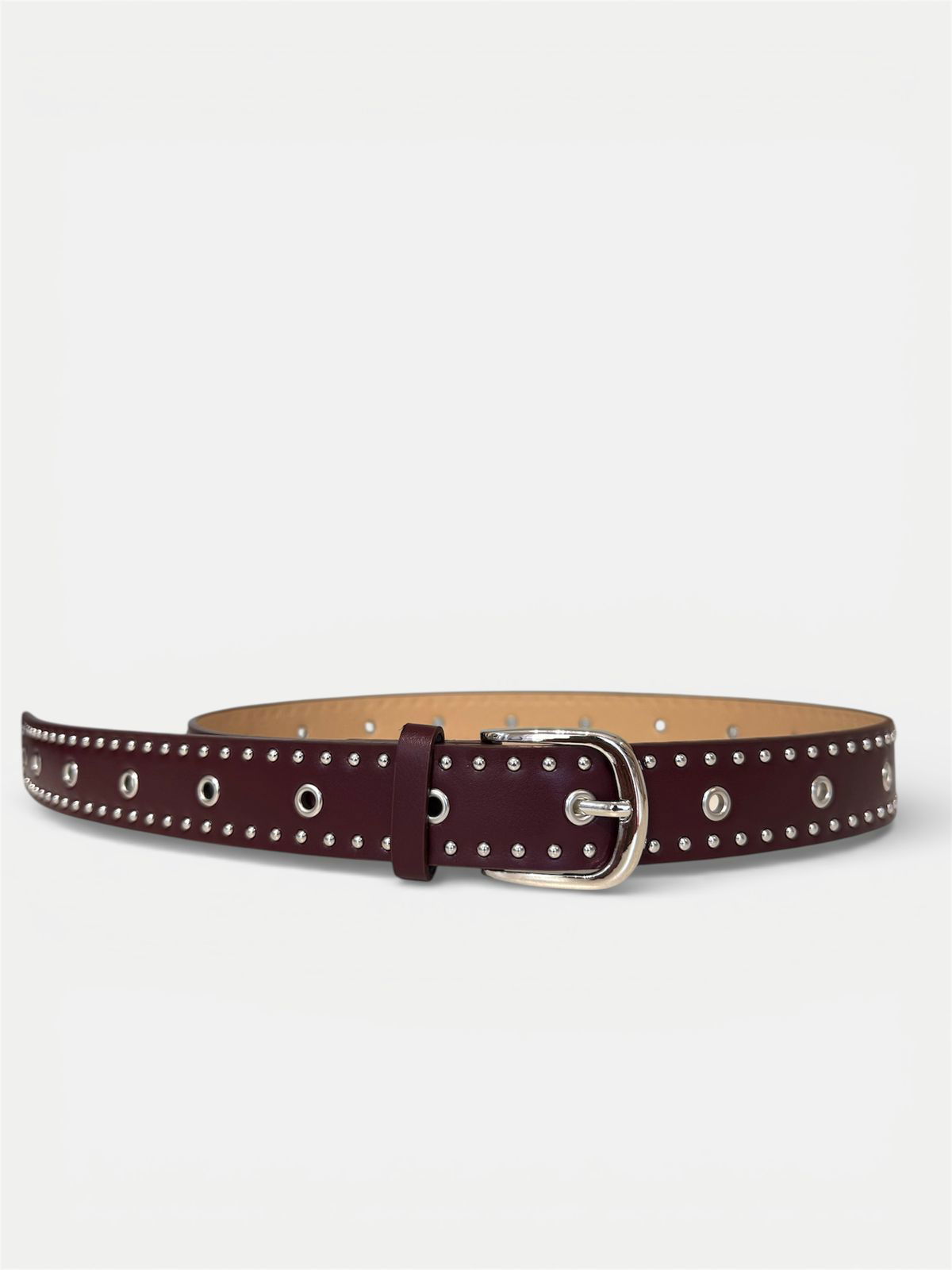 Cinto de cuero ecológico con ojales y hebilla metálica regulable.