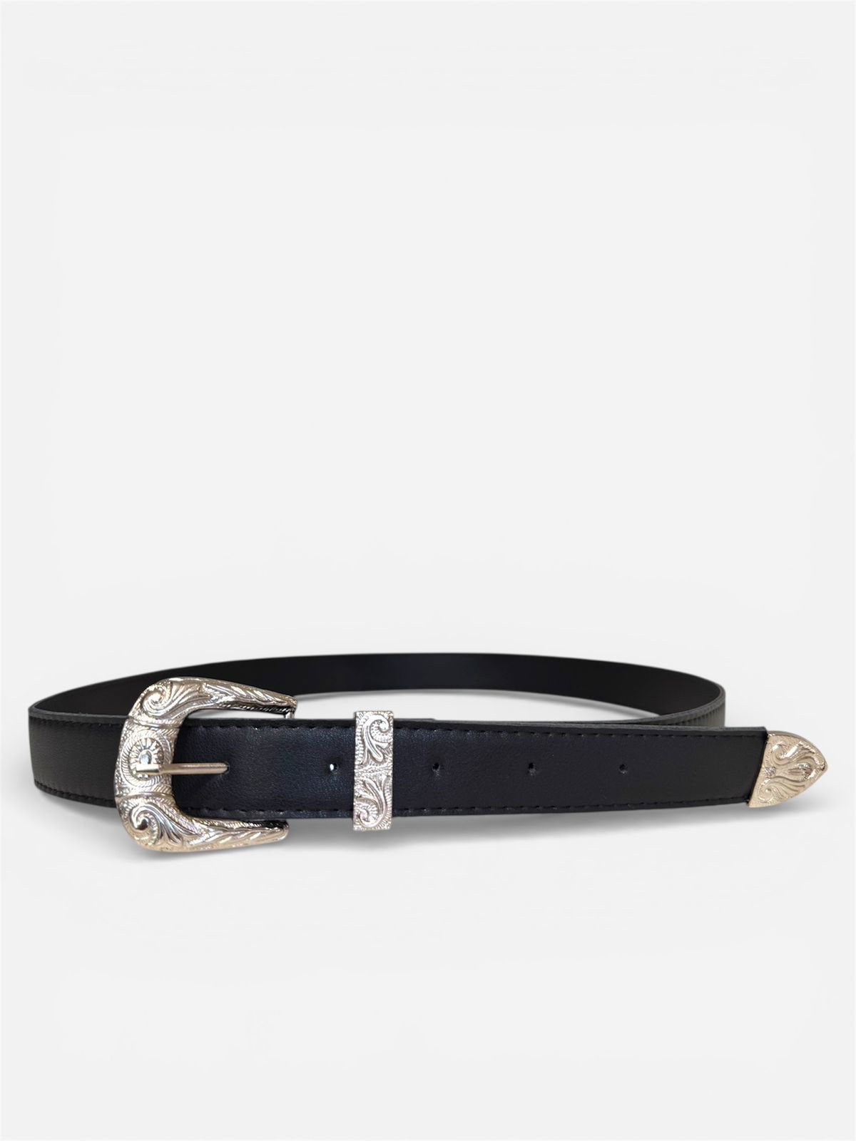 Cinto de cuero ecológico con hebilla metálica regulable.