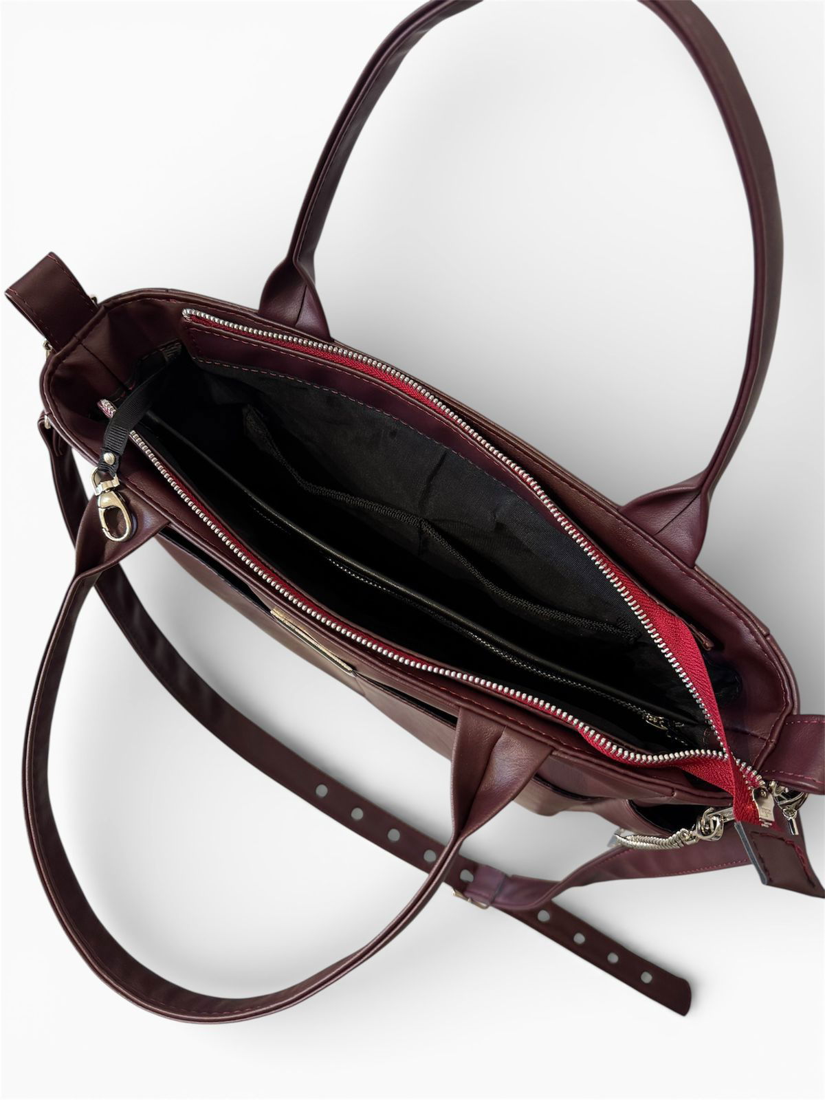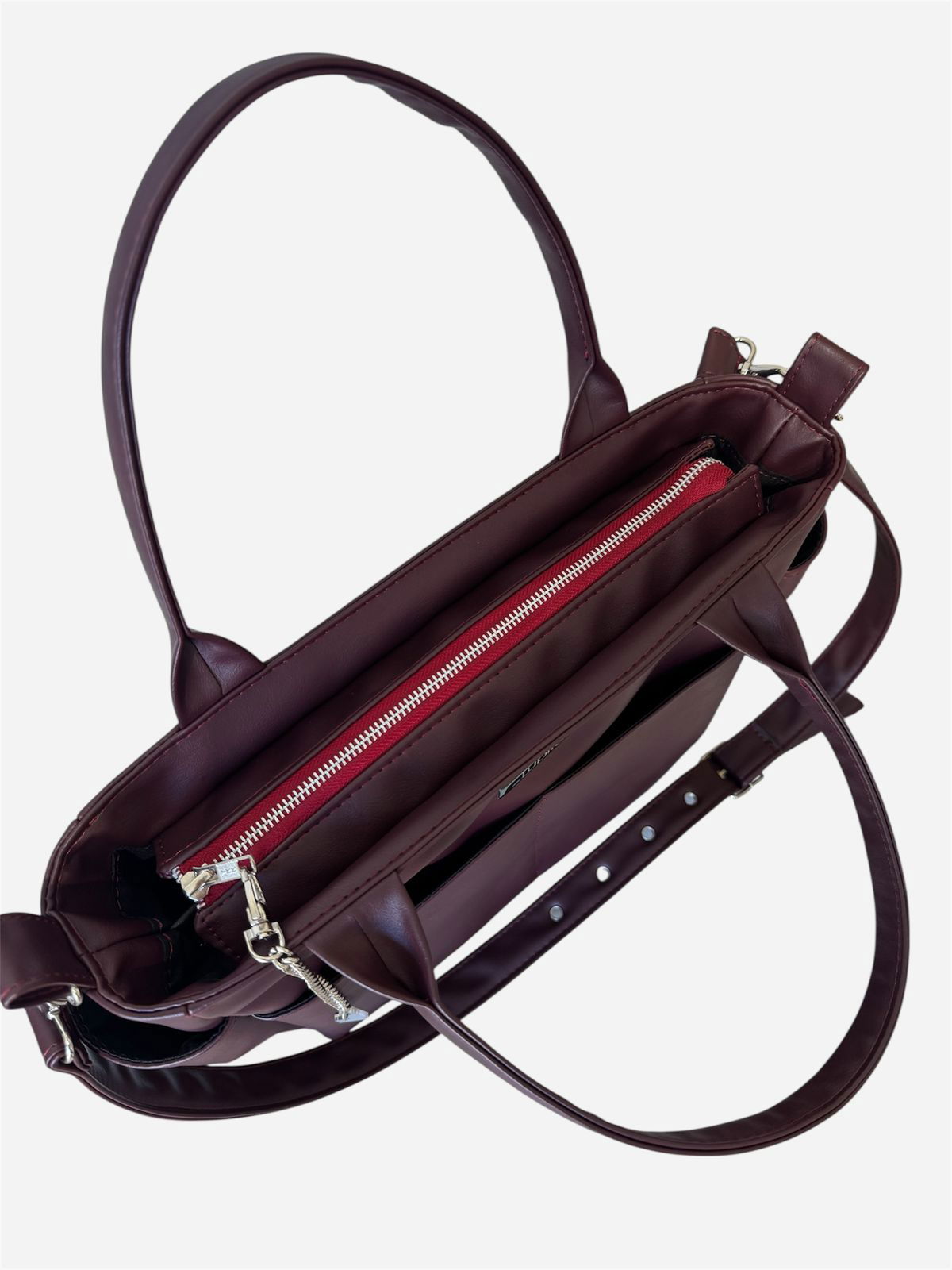 En el exterior, tiene dos bolsillos frontales y dos bolsillos laterales portabotellas. Se puede llevar cómodamente del antebrazo gracias a sus manijas cortas, o al hombro con la correa larga regulable tipo cinto, con ojales metálicos y hebilla.
